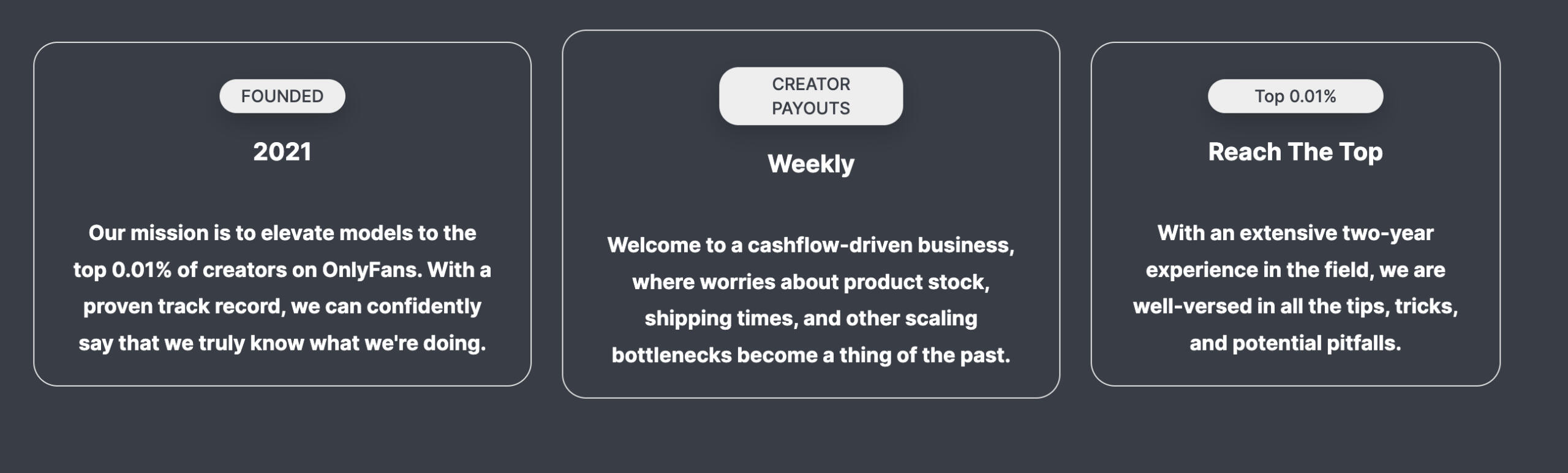 In a landscape with over 2 million creators on OnlyFans and a constant influx of new entrants, the competition has intensified. The average monthly income for creators hovers around $180, but the lion's share goes to the top 4% of performers who are associated with agencies. By collaborating with us, you unlock access to our valuable resources, vast network, and expert guidance, giving you a competitive edge and positioning you ahead of the curve.
